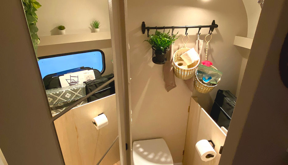 Helles Holz, gemütliche Polster und liebevolle Details im Vintage-Stil verleihen dem Wohnwagen einen zeitlosen, behaglichen Charakter. Dezente Dekorationen und warme Farben sorgen für eine entspannte Atmosphäre – ein perfekter Rückzugsort auf Reisen.